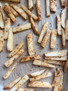 Slice your potatoes into small, evenly sized fries. Nothing fancy, just try to keep them around the same size so they cook evenly. Whether you peel them or not is totally up to you. I usually just slice a little sliver of skin off the top, bottom, and sides and leave the rest. A little skin doesn’t bother us one bit.