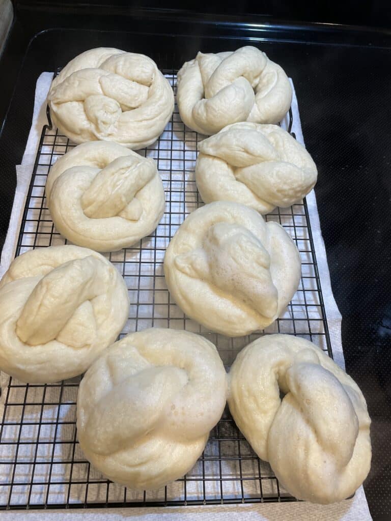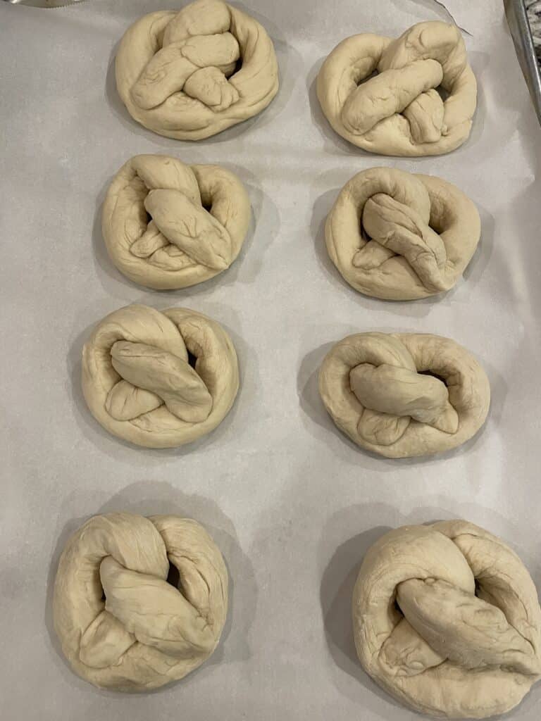 • Twist the two ends around each other, leaving a loop at the bottom. Fold the ends down to create the pretzel shape. Let rest for 30 minutes while you preheat the oven to 425℉.