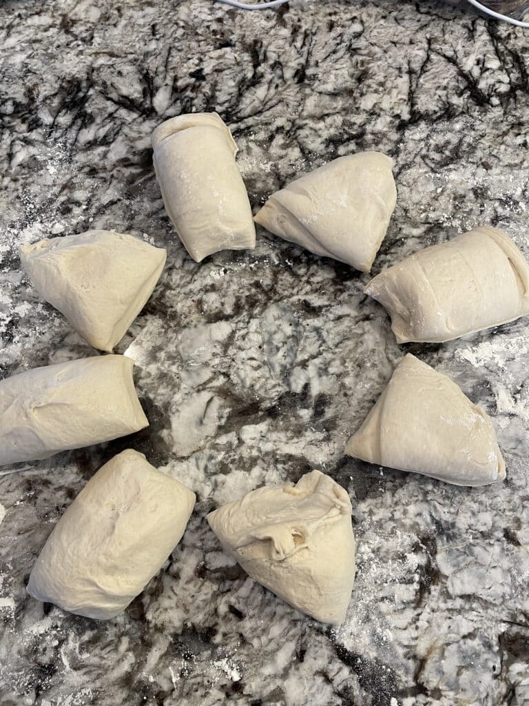 • Turn the dough out onto a lightly floured surface and cut into 8 equal pieces. Roll each piece into a long rope.