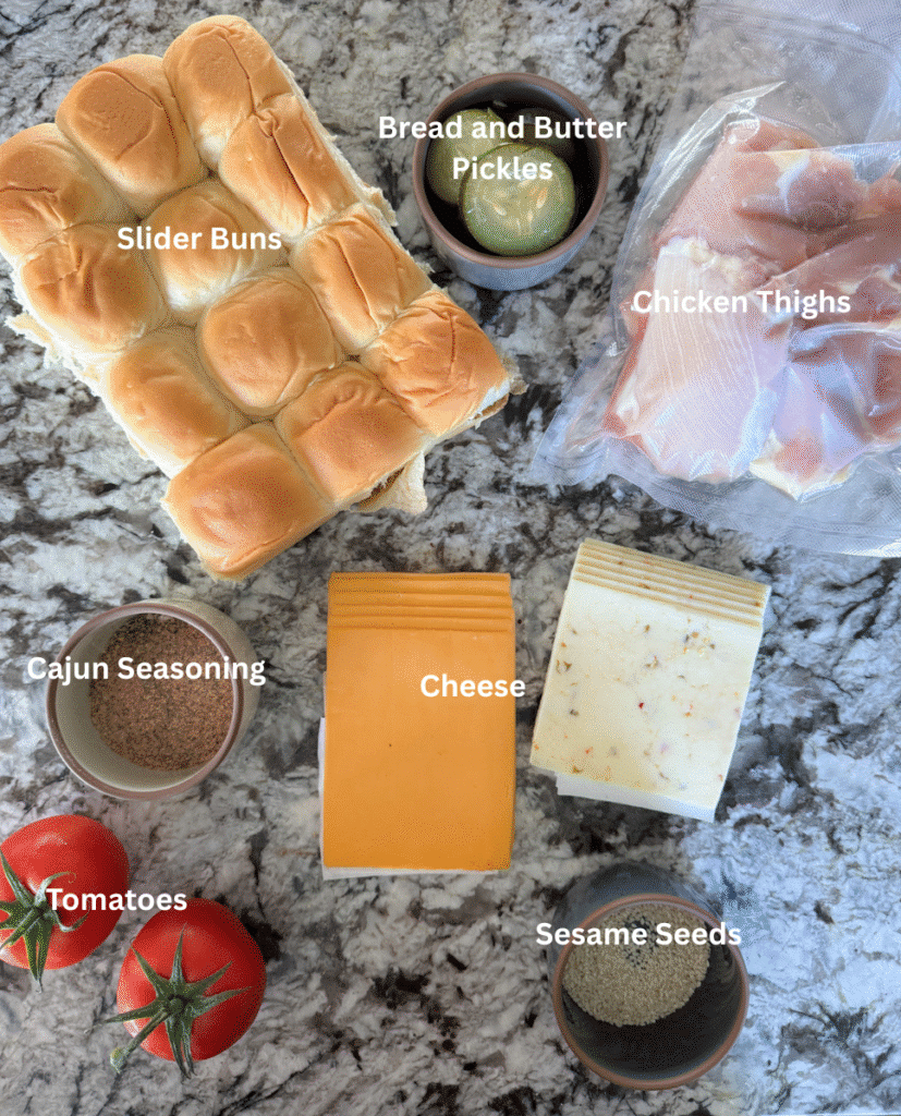 Slice your slider buns in half horizontally. Layer on the pepper jack cheese, then the cooked chicken, followed by sharp cheddar, tomato slices, and pickles. Add the top buns, brush them with melted butter, and sprinkle sesame seeds over the top.