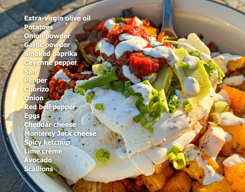• Add 1/4 of the potatoes, 1/4 of the vegetables and chorizo to a bowl. Top with some of the cheddar and Monterey Jack Cheese. Add 2 cooked eggs. Serve with Spicy Ketchup, Lime Creme, smashed avocado and chopped scallions.